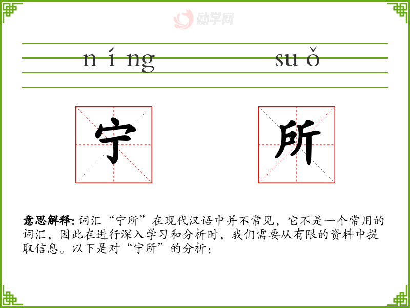 词汇“宁所”在现代汉语中并不常见,它不是一个常用的词汇,因此在进行深入学习和分析时,我们需要从有限的资料中提取信息。以下是对“宁所”的分析: