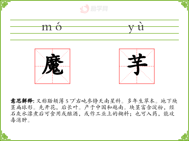 魔芋的意思是:又称聒颉薄5プ右吨参铮天南星科。多年生草本。地下块茎扁球形。先开花,后长叶。产于中国和越南。块茎富含淀粉,经石灰水漂煮后可食用或酿酒,或作工业上的糊料;也可入药,能攻毒消肿。
