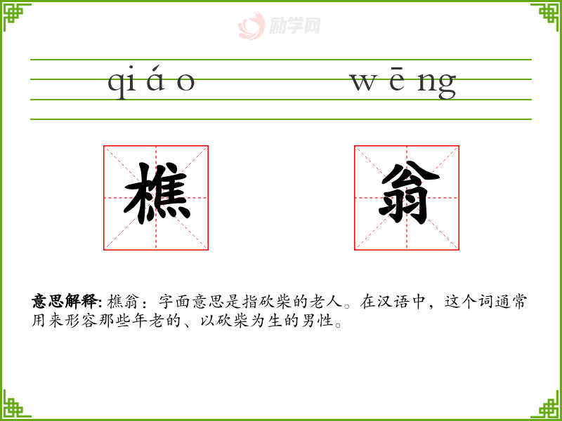 樵翁:字面意思是指砍柴的老人。在汉语中,这个词通常用来形容那些年老的、以砍柴为生的男性。