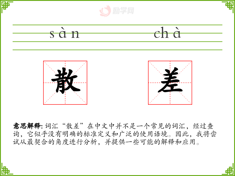 总结来说,“散差”是一个不常见的词汇,它的含义和用法可能需要具体的语境来确定。在语言学习和表达中,它可能不是一个重要的词汇。