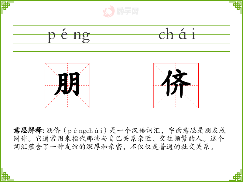 朋侪(péngchái)是一个汉语词汇,字面意思是朋友或同伴。它通常用来指代那些与自己关系亲近、交往频繁的人。这个词汇蕴含了一种友谊的深厚和亲密,不仅仅是普通的社交关系。