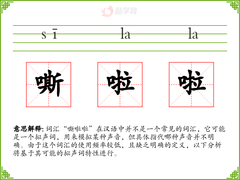 词汇“嘶啦啦”在汉语中并不是一个常见的词汇,它可能是一个拟声词,用来模拟某种声音,但具体指代哪种声音并不明确。由于这个词汇的使用频率较低,且缺乏明确的定义,以下分析将基于其可能的拟声词特性进行。