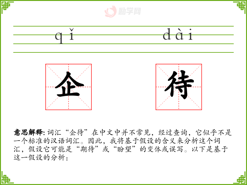 词汇“企待”在中文中并不常见,经过查询,它似乎不是一个标准的汉语词汇。因此,我将基于假设的含义来分析这个词汇,假设它可能是“期待”或“盼望”的变体或误写。以下是基于这一假设的分析: