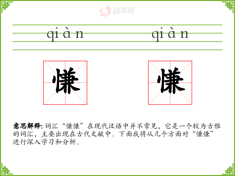 词汇“慊慊”在现代汉语中并不常见,它是一个较为古雅的词汇,主要出现在古代文献中。下面我将从几个方面对“慊慊”进行深入学*和分析。