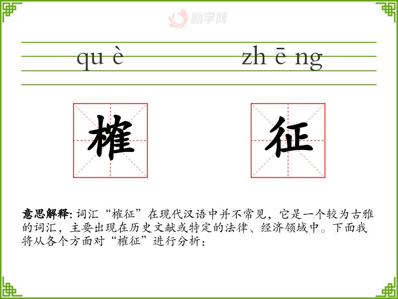 词汇“榷征”在现代汉语中并不常见,它是一个较为古雅的词汇,主要出现在历史文献或特定的法律、经济领域中。下面我将从各个方面对“榷征”进行分析: