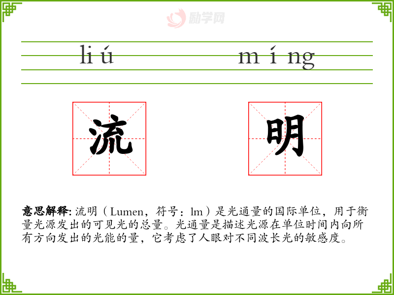 流明的意思是:光通量单位,1国际烛光照射在距离为1厘米、面积为1平方厘米的平面上的光通量,就是1流明。简称流。[英lumen]
