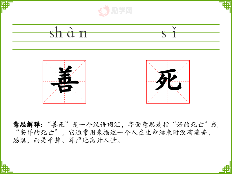 “善死”是一个汉语词汇,字面意思是指“好的死亡”或“安详的死亡”。它通常用来描述一个人在生命结束时没有痛苦、恐惧,而是平静、尊严地离开人世。