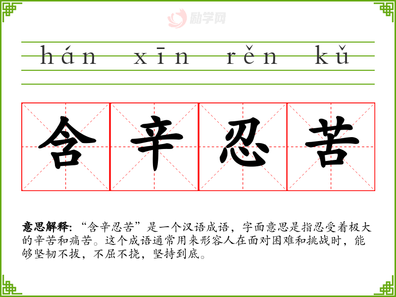 “含辛忍苦”是一个汉语成语,字面意思是指忍受着极大的辛苦和痛苦。这个成语通常用来形容人在面对困难和挑战时,能够坚韧不拔,不屈不挠,坚持到底。
