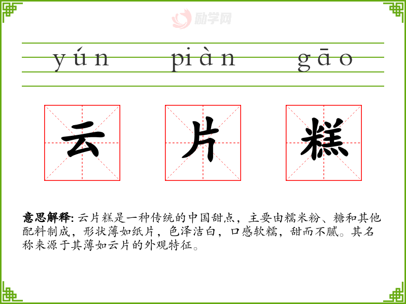 - 反义词:无(由于云片糕是一个特定食品,没有直接的反义词)