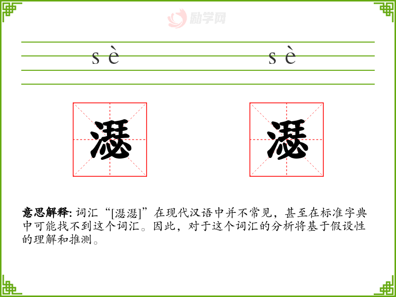 由于“[濏濏]”不是一个标准词汇,我们无法提供确切的基本定义。但从字形上看,它由两个“氵”(水的偏旁)和一个“瑟”字组成,可能与水或液体的状态有关。