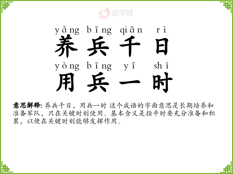 养兵千日,用兵一时 这个成语的字面意思是长期培养和准备军队,只在关键时刻使用。基本含义是指平时要充分准备和积累,以便在关键时刻能够发挥作用。