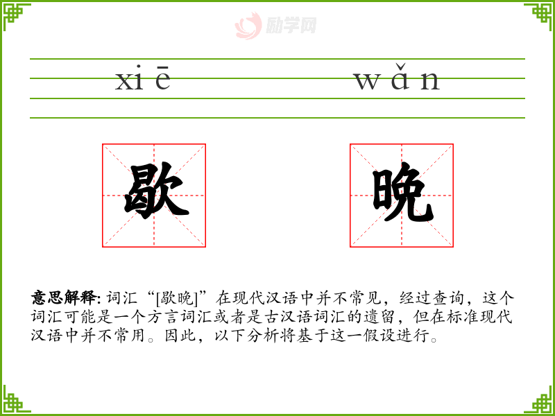 词汇“[歇晚]”在现代汉语中并不常见,经过查询,这个词汇可能是一个方言词汇或者是古汉语词汇的遗留,但在标准现代汉语中并不常用。因此,以下分析将基于这一假设进行。