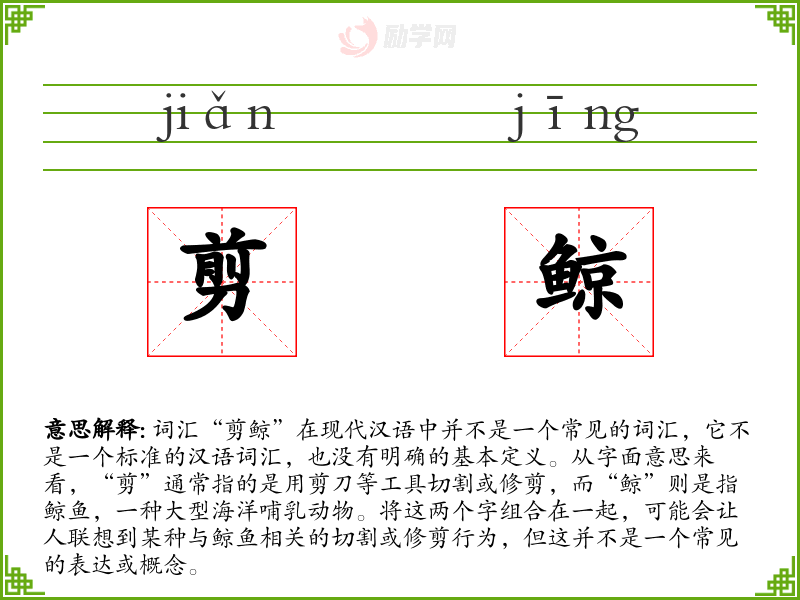 词汇“剪鲸”在现代汉语中并不是一个常见的词汇,它不是一个标准的汉语词汇,也没有明确的基本定义。从字面意思来看,“剪”通常指的是用剪刀等工具切割或修剪,而“鲸”则是指鲸鱼,一种大型海洋哺乳动物。将这两个字组合在一起,可能会让人联想到某种与鲸鱼相关的切割或修剪行为,但这并不是一个常见的表达或概念。