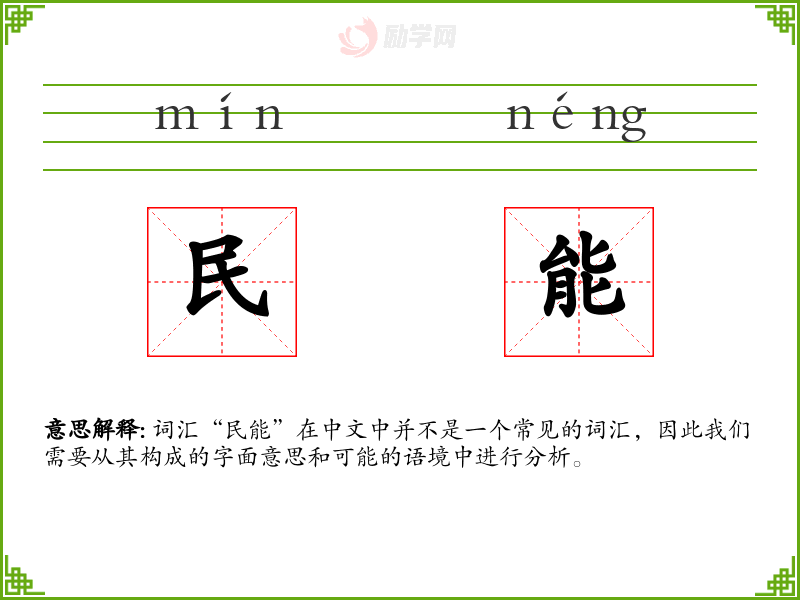 词汇“民能”在中文中并不是一个常见的词汇,因此我们需要从其构成的字面意思和可能的语境中进行分析。