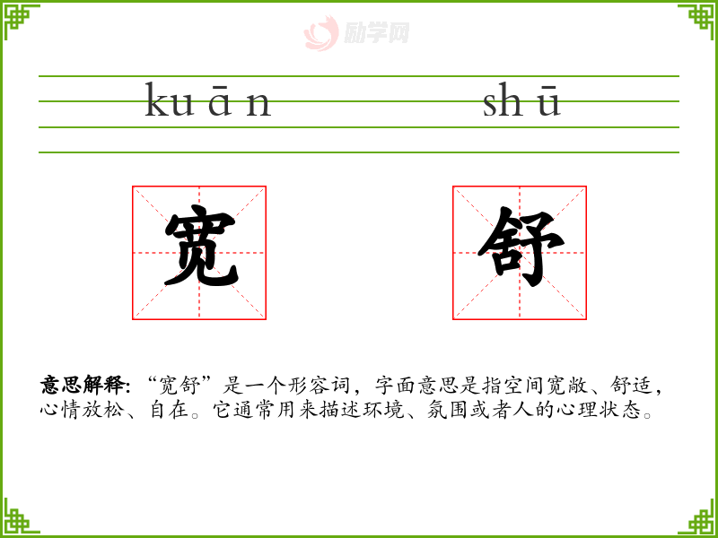 “宽舒”由“宽”和“舒”两个字组成,“宽”指空间大,“舒”指伸展、放松。这两个字结合在一起,形成了描述空间和心理状态的词汇。
