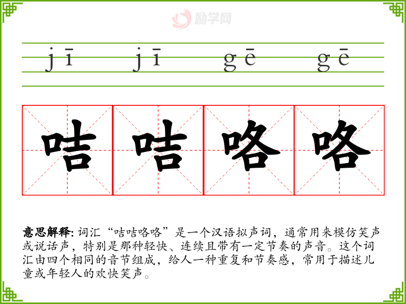 词汇“咭咭咯咯”是一个汉语拟声词,通常用来模仿笑声或说话声,特别是那种轻快、连续且带有一定节奏的声音。这个词汇由四个相同的音节组成,给人一种重复和节奏感,常用于描述儿童或年轻人的欢快笑声。