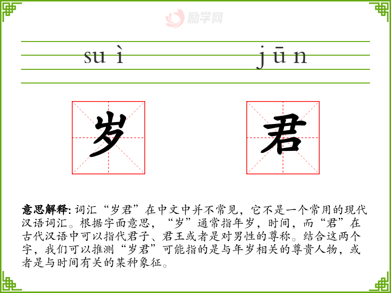 由于“岁君”不是一个常用词汇,它在现代文学、口语或专业领域中很少出现。在古代文献中,如果出现,可能是用于特定的文学或语境,表达对时间的尊重或对年的敬意。