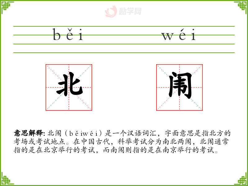 北闱(běiwéi)是一个汉语词汇,字面意思是指北方的考场或考试地点。在**古代,科举考试分为南北两闱,北闱通常指的是在北京举行的考试,而南闱则指的是在南京举行的考试。
