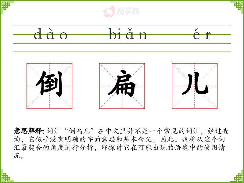 由于“倒扁儿”不是一个标准词汇,我们无法给出确切的基本定义。它可能是一个方言词汇或者是某个特定社群中的俚语,但在普通话中并不常见。