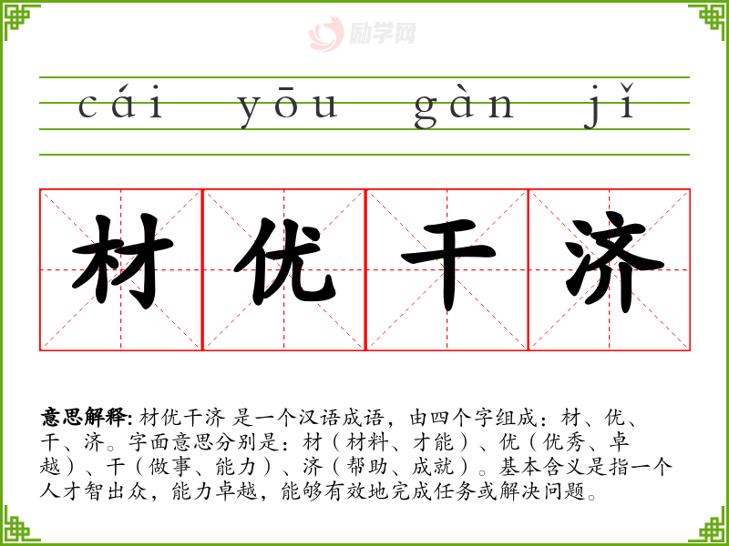 材优干济 是一个汉语成语,由四个字组成:材、优、干、济。字面意思分别是:材(材料、才能)、优(优秀、卓越)、干(做事、能力)、济(帮助、成就)。基本含义是指一个人才智出众,能力卓越,能够有效地完成任务或解决问题。