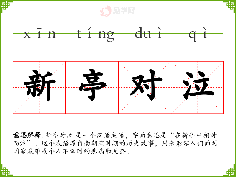 新亭对泣 是一个汉语成语,字面意思是“在新亭中相对而泣”。这个成语源自南朝宋时期的历史故事,用来形容人们面对国家危难或个人不幸时的悲痛和无奈。