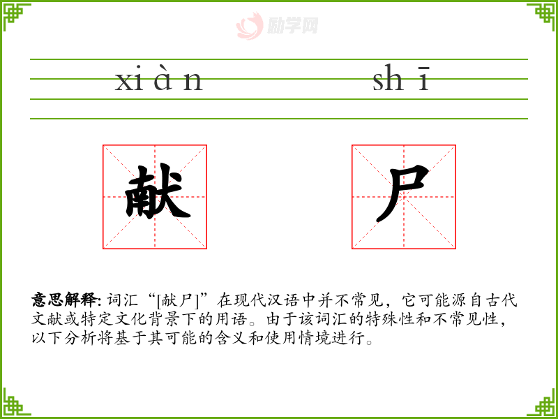 词汇“[献尸]”在现代汉语中并不常见,它可能源自古代文献或特定文化背景下的用语。由于该词汇的特殊性和不常见性,以下分析将基于其可能的含义和使用情境进行。