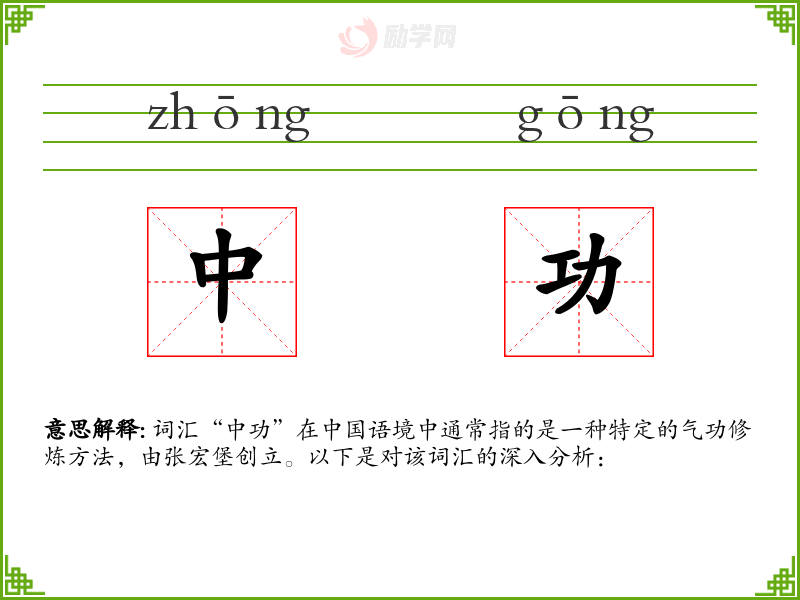 词汇“中功”在**语境中通常指的是一种特定的气功修炼方法,由张宏堡创立。以下是对该词汇的深入分析: