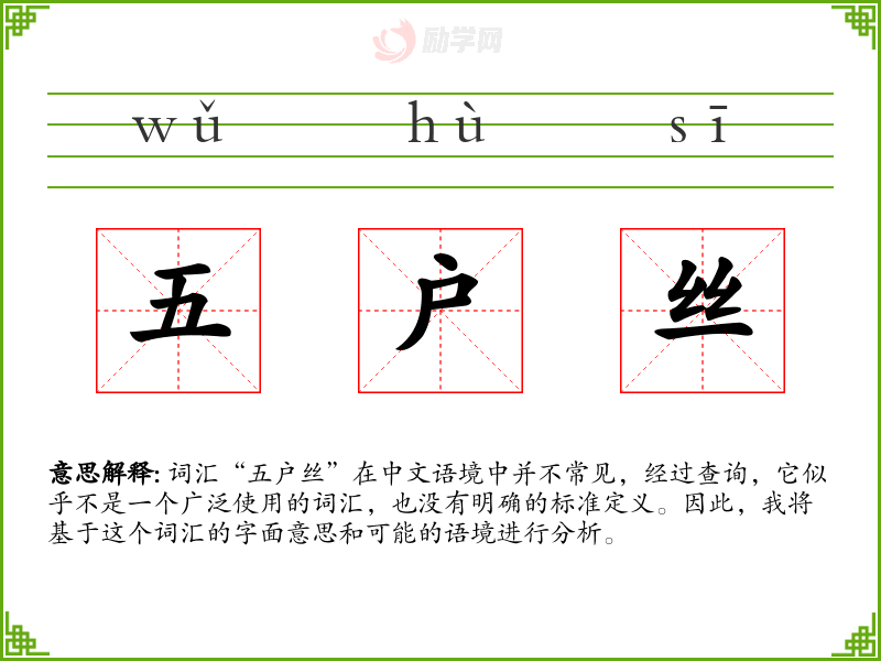 词汇“五户丝”在中文语境中并不常见,经过查询,它似乎不是一个广泛使用的词汇,也没有明确的标准定义。因此,我将基于这个词汇的字面意思和可能的语境进行分析。