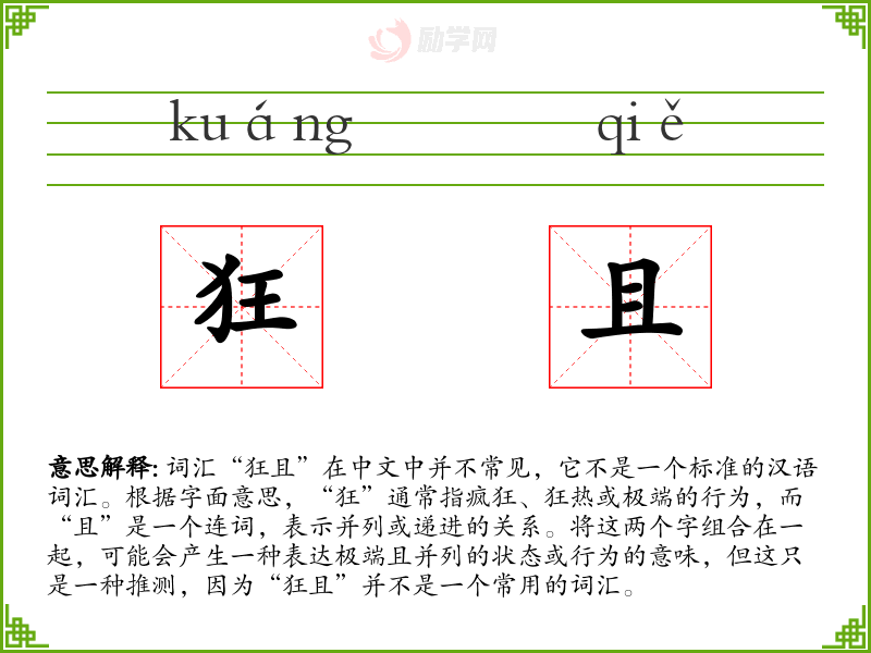 词汇“狂且”在中文中并不常见,它不是一个标准的汉语词汇。根据字面意思,“狂”通常指疯狂、狂热或极端的行为,而“且”是一个连词,表示并列或递进的关系。将这两个字组合在一起,可能会产生一种表达极端且并列的状态或行为的意味,但这只是一种推测,因为“狂且”并不是一个常用的词汇。