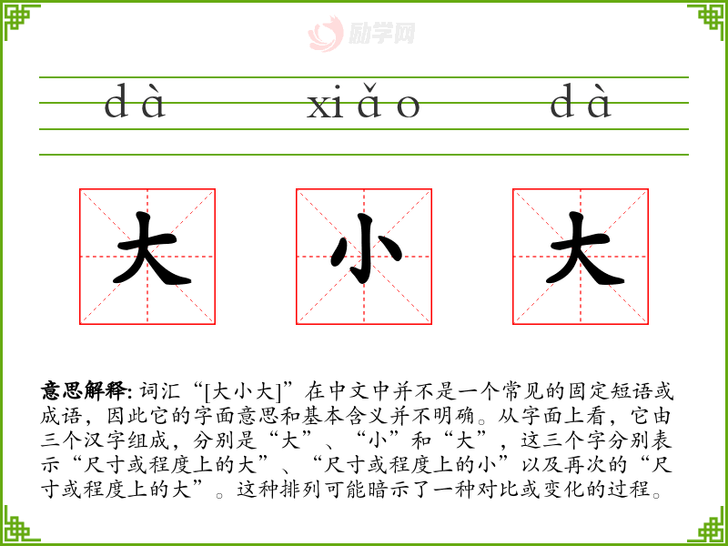 “[大小大]”这个词汇虽然不是一个标准词汇,但它提供了一种描述变化和波动的方式。在语言学习和表达中,它可以作为一种创造性的工具,用来丰富表达方式和增强语言的生动性。