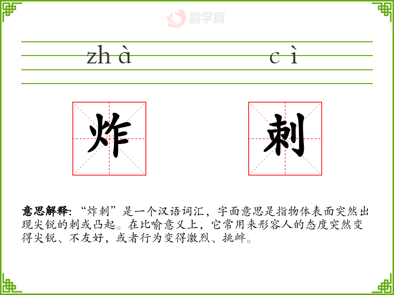 “炸刺”是一个汉语词汇,字面意思是指物体表面突然出现尖锐的刺或凸起。在比喻意义上,它常用来形容人的态度突然变得尖锐、不友好,或者行为变得激烈、挑衅。