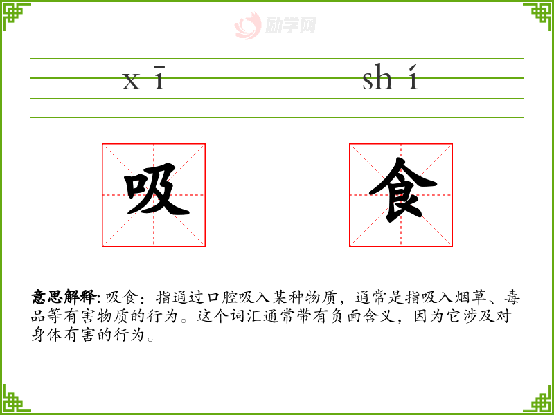 吸食:指通过口腔吸入某种物质,通常是指吸入烟草、毒品等有害物质的行为。这个词汇通常带有负面含义,因为它涉及对身体有害的行为。