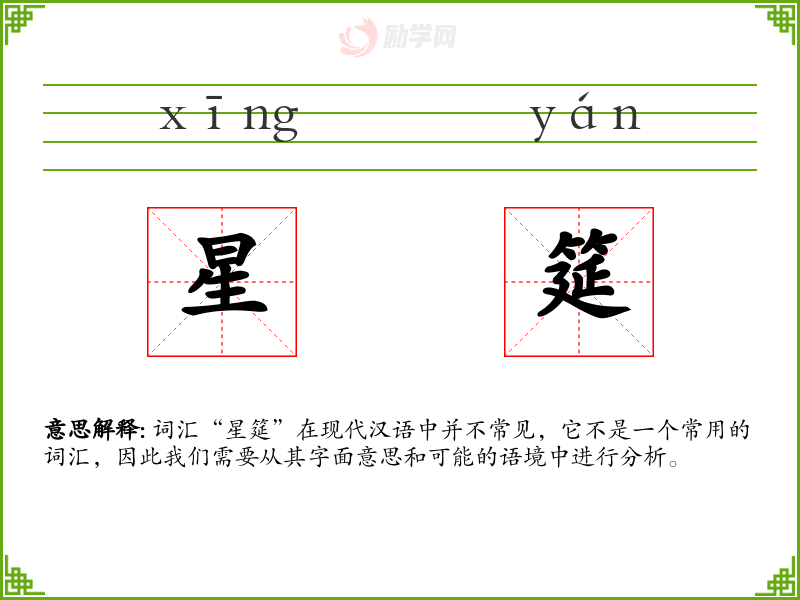 词汇“星筵”在现代汉语中并不常见,它不是一个常用的词汇,因此我们需要从其字面意思和可能的语境中进行分析。