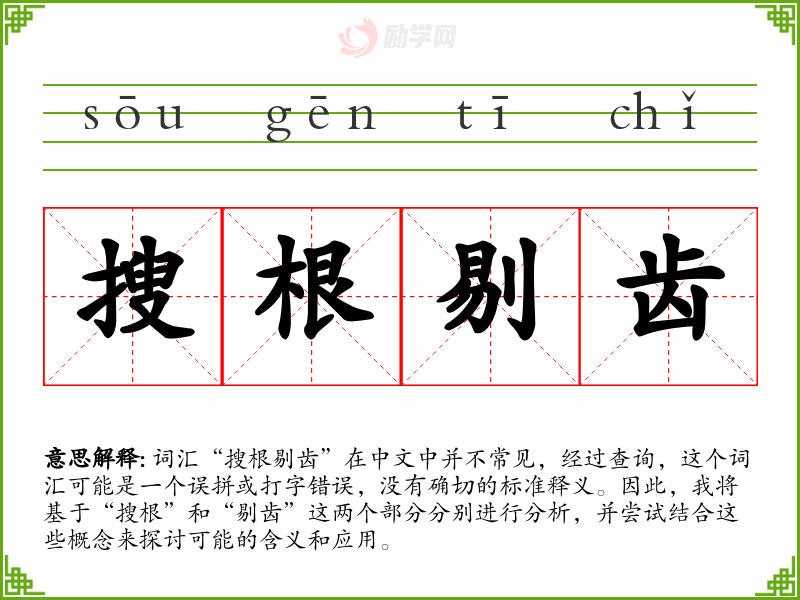 - 尽管“搜根剔齿”不是一个标准词汇,但通过对其组成部分的分析,我们可以理解其在不同语境下的潜在含义和应用。在语言学习和表达中,理解词汇的组成部分有助于更准确地把握其意义和用法。