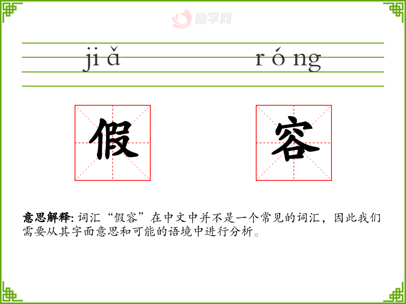 词汇“假容”在中文中并不是一个常见的词汇,因此我们需要从其字面意思和可能的语境中进行分析。