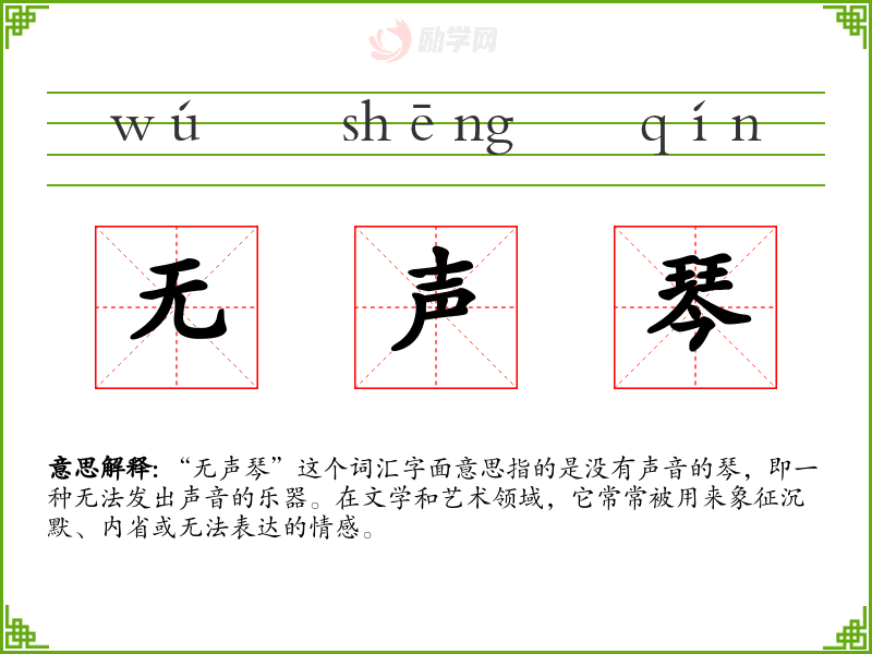 “无声琴”这个词汇字面意思指的是没有声音的琴,即一种无法发出声音的乐器。在文学和艺术领域,它常常被用来象征沉默、内省或无法表达的情感。