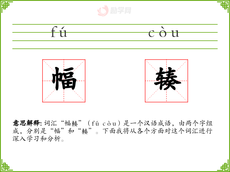 词汇“幅輳”(fú còu)是一个汉语成语,由两个字组成,分别是“幅”和“輳”。下面我将从各个方面对这个词汇进行深入学*和分析。