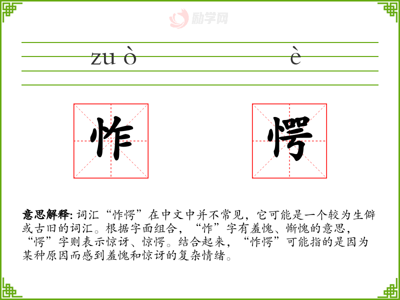 - “怍愕”这个词虽然不常用,但它丰富了汉语的情感表达,提供了更细腻的情感描述方式。
