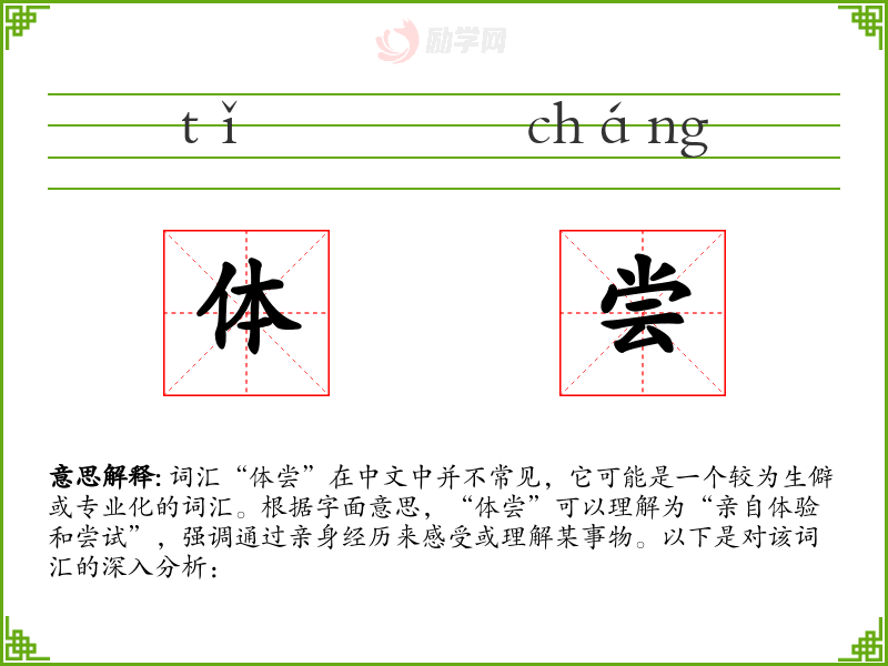 “体尝”的字面意思是通过身体和感官去体验和尝试某事物,强调亲身经历的重要性。