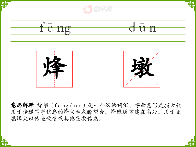 - 反义词:和平、安宁、宁静(这些词汇与烽墩所代表的战争和紧急情况形成对比)