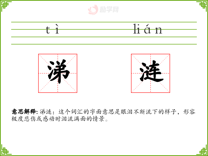 涕涟:这个词汇的字面意思是眼泪不断流下的样子,形容极度悲伤或感动时泪流满面的情景。