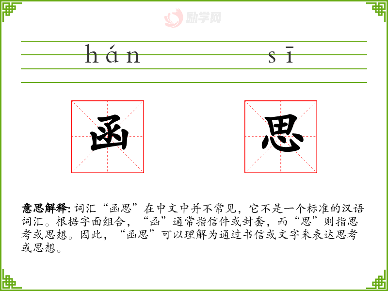- 反义词:无(由于“函思”不是一个常用词汇,反义词不适用)