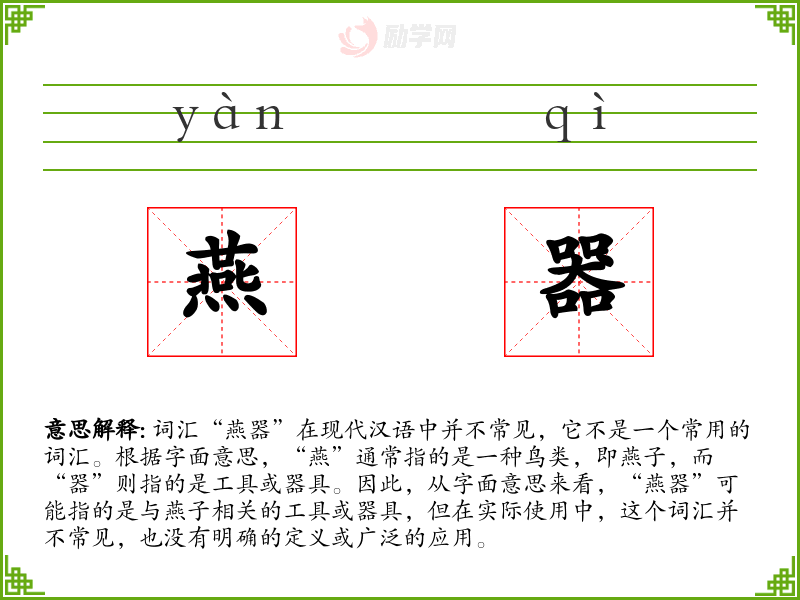 由于“燕器”不是一个常用词汇,没有明确的基本含义。它可能是一个特定领域或特定文化背景下的术语,但在广泛的语言使用中并不常见。