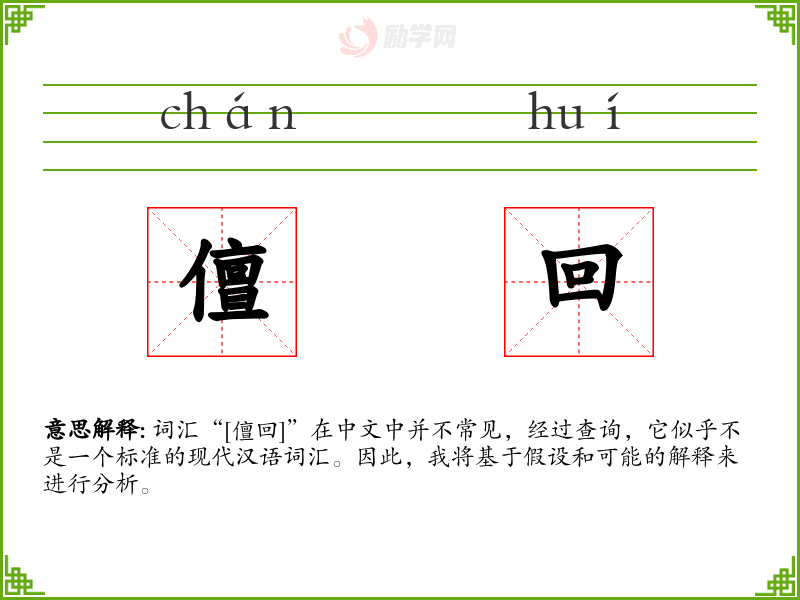 总结来说,词汇“[儃回]”的分析由于缺乏确切的信息而无法进行。这强调了在语言学习和研究中,对词汇的准确理解和定义的重要性。