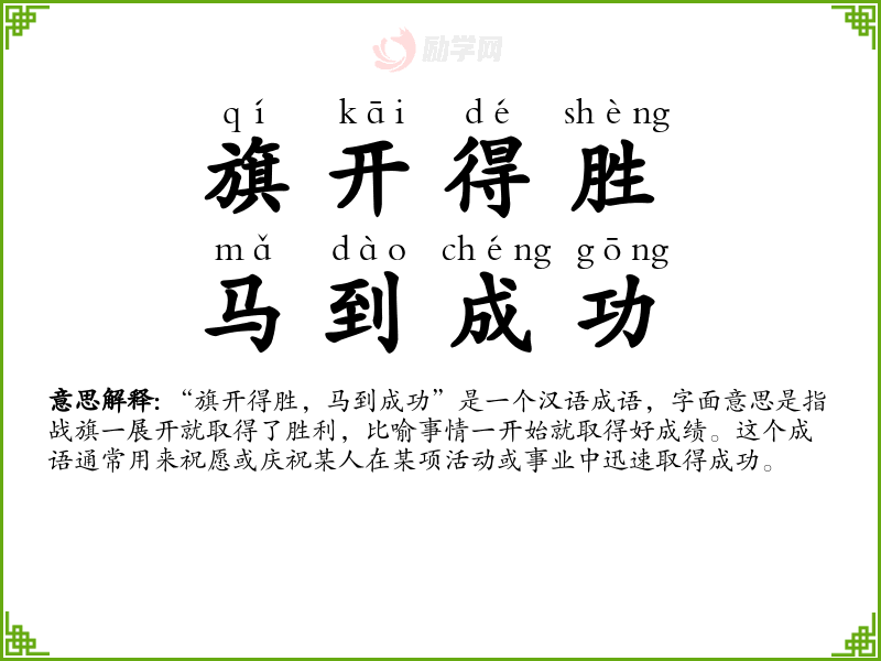 “旗开得胜,马到成功”是一个汉语成语,字面意思是指战旗一展开就取得了胜利,比喻事情一开始就取得好成绩。这个成语通常用来祝愿或庆祝某人在某项活动或事业中迅速取得成功。