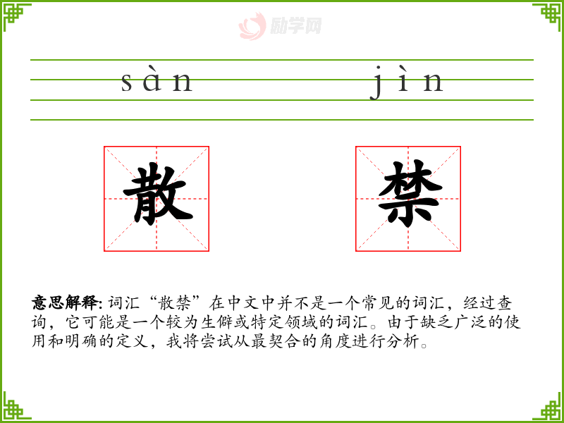 词汇“散禁”在中文中并不是一个常见的词汇,经过查询,它可能是一个较为生僻或特定领域的词汇。由于缺乏广泛的使用和明确的定义,我将尝试从最契合的角度进行分析。