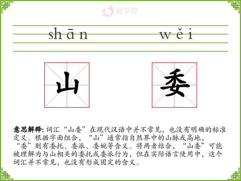 由于“山委”不是一个标准词汇,我们无法给出一个确切的基本定义。它可能是一个方言词汇、古文中的用法,或者是某个特定社群中的术语,但在普通话中并不常用。