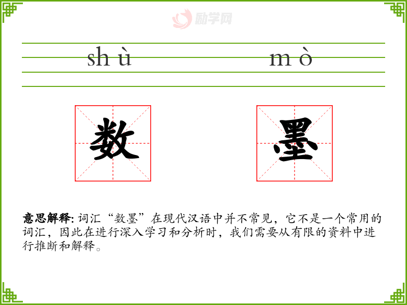 “数墨”的字面意思可能与计算墨水的使用量有关,但在现代汉语中,它并没有明确的定义。在古代文献中,“数墨”可能指的是计算书写时所用的墨水量,或者引申为计算文字的数量。
