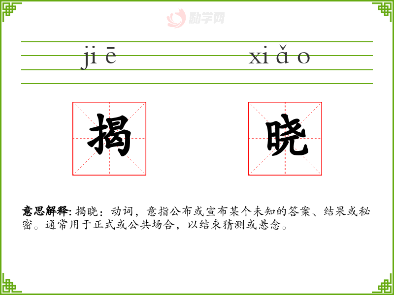 揭晓:动词,意指公布或宣布某个未知的答案、结果或秘密。通常用于正式或公共场合,以结束猜测或悬念。