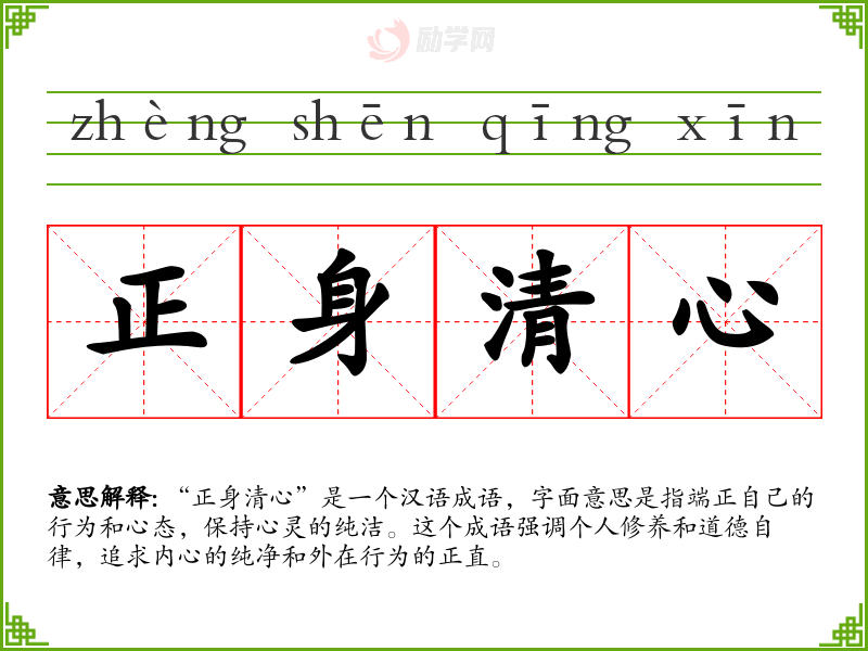 - 文学语境:在文学作品中,这个成语常用来形容主人公的高尚品质和道德情操,如“他一生正身清心,深受人们敬仰。”